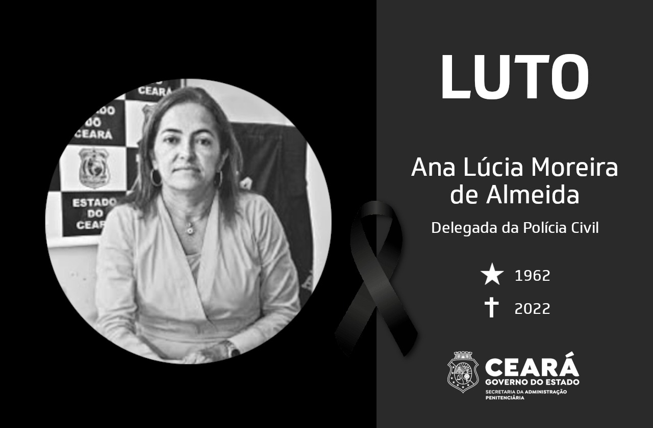 A Secretaria da Administração Penitenciária lamenta, com profundo pesar, o falecimento da delegada da Polícia Civil do Estado do Ceará (PC-CE), Ana Lúcia Moreira de Almeida. A todos os familiares e amigos, os nossos mais sinceros sentimentos. Que Deus os conforte neste momento de dor.