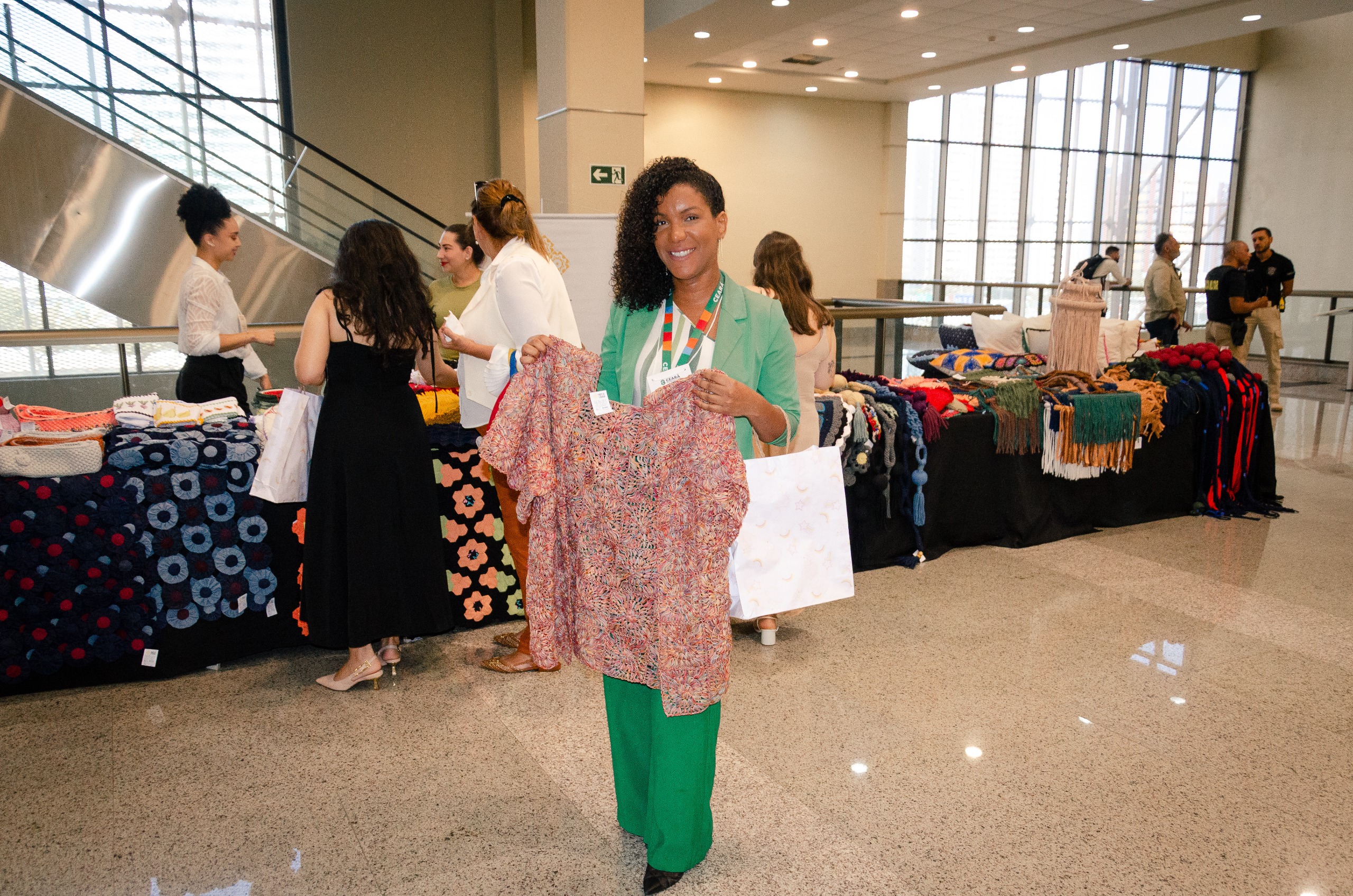 Durante a programação, os participantes também conheceram o projeto “Arte em Cadeia”, que apresentou uma exposição de mais de 250 peças produzidas por artesãos e artesãs do sistema prisional. Almofadas de chita, mochilas de patchwork, jogos americanos de vagonite, produtos em ponto cruz, bolsas de macramê e crochê estiveram entre os itens expostos e disponíveis para venda, mostrando a criatividade e o potencial de trabalho desenvolvido nas unidades prisionais.