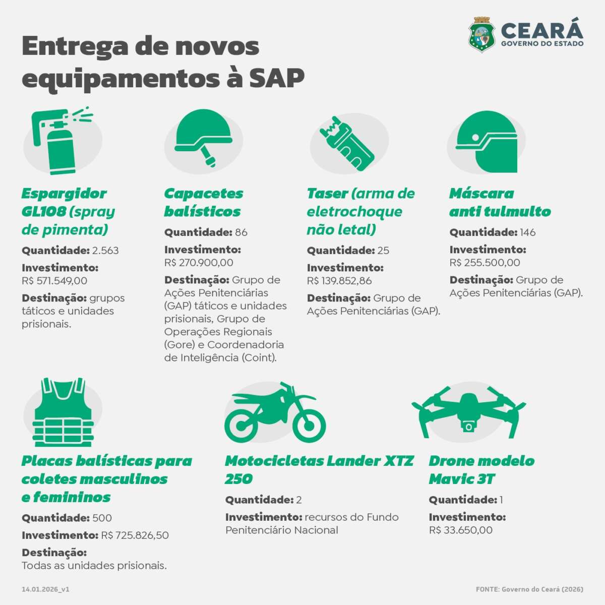 A ação integra o programa Ceará Contra o Crime. Com essa nova entrega, a atual gestão chega a 45.792 já adquiridos. A expectativa é chegar a 52.281 equipamentos entregues às Forças de Segurança até o fim de 2026.